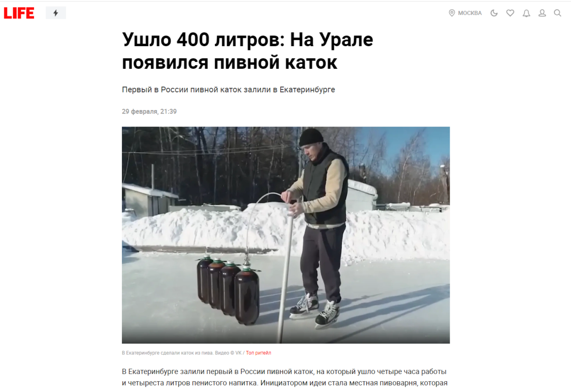 Мы подумали: на Урале холодно примерно 5 месяцев в году, а в лёд превращается практически любой водоём. Поэтому катков много, и они весьма востребованы. А почему бы не совместить приятное с полезным и не залить каток из пива?