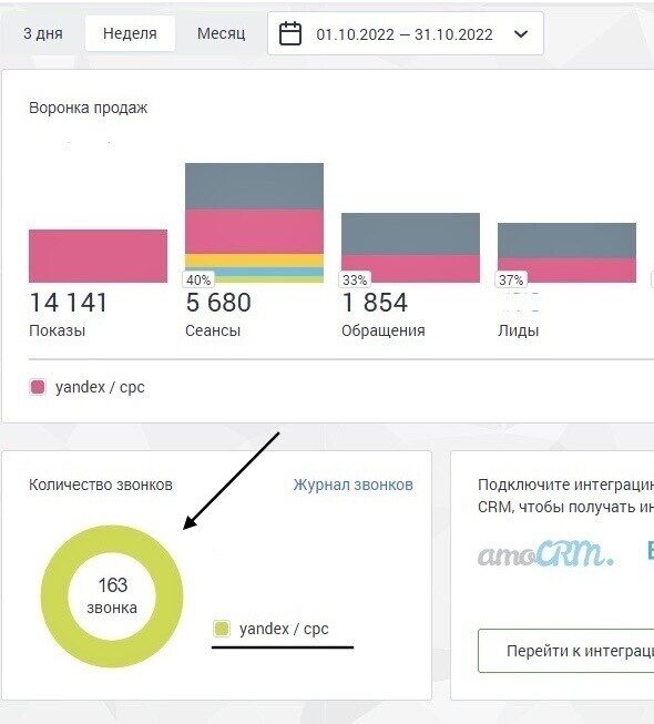 Данные из кабинета Mango Office по фильтру контекстной рекламы за первый месяц.