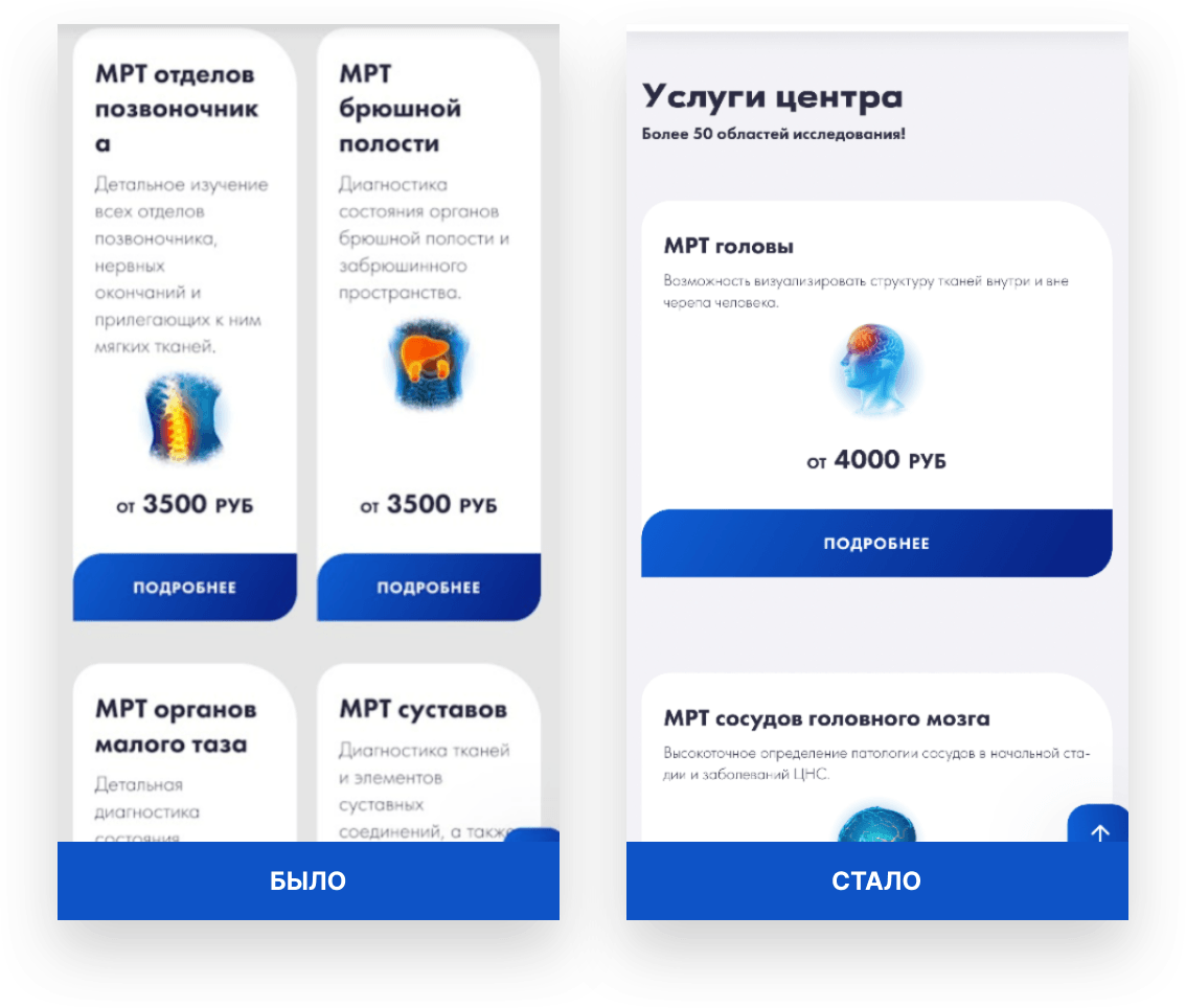 ‣ На старте выделили с клиентом ряд приоритетных услуг для создания групп услуг МРТ: головы, суставов, позвоночника, комплексы. Так мы смогли перераспределить бюджет на самые маржинальные услуги клиента.