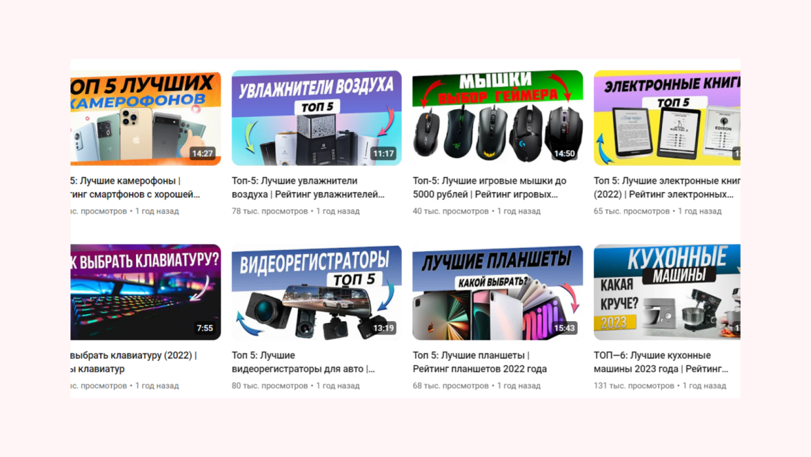 Для обложки универсального рецепта нет, потому что тренды постоянно меняются. Здесь у нас тоже со временем сформировался свой стандарт: размещаем на картинке 3 лидеров рейтинга и надпись с названием категории товара большими буквами. Акцентный цвет подбираем исходя из поисковой выдачи по нашей теме: если все ролики по нужному запросу с красным цветом, мы сделаем с синим. Всё это, разумеется, не строжайший канон: дизайнер не фармацевт и может экспериментировать. Главное — результат.