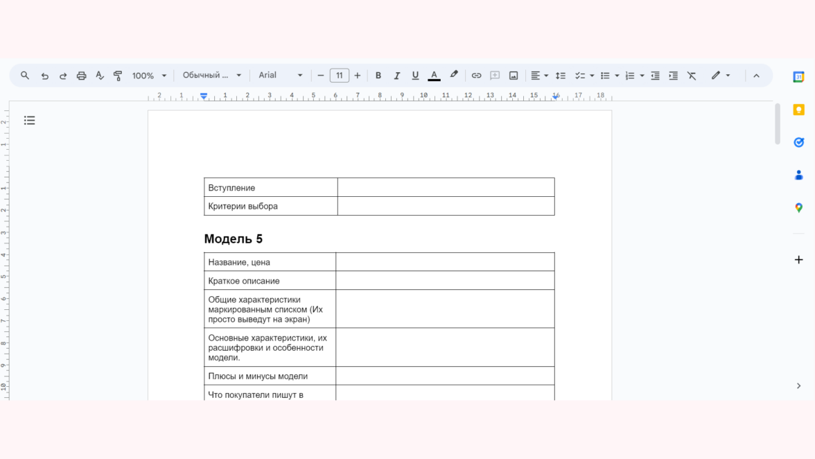 После согласования моделей приступаем к основе ролика — сценарию. У нас есть стандартная структура для видеорейтингов, которая помогает авторам разбить работу над сценарием на этапы и не растекаться мыслью по гуглдоку.