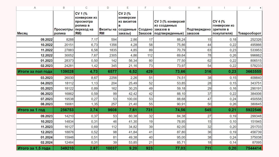 Как уже сказано выше, этот ролик зашёл сразу и статистика более или менее ровная за все полтора года наблюдений. Для удобства свели результаты в таблицу с шагом по месяцу и итогами по полугодиям.