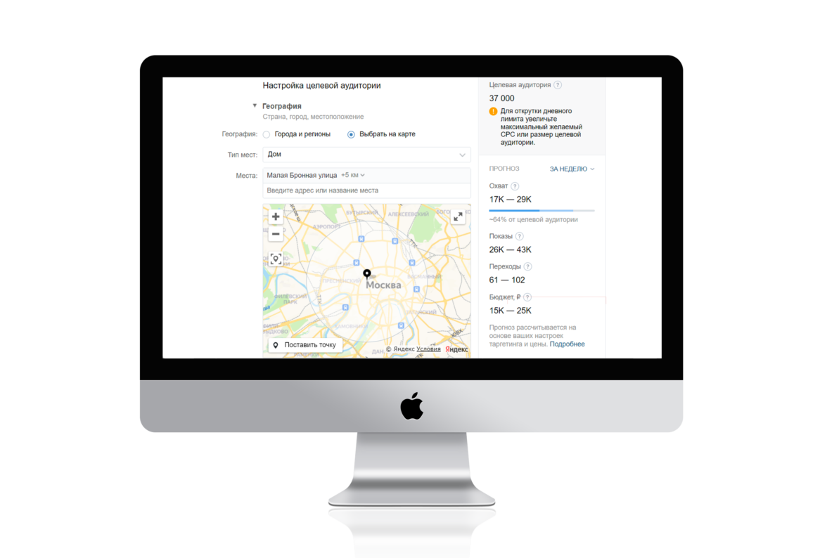 Пример таргетинга: мужчины и женщины старше 35 лет, живут в радиусе 5 км от улицы Малая Бронная