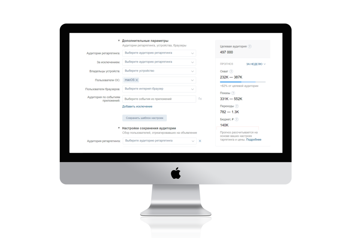 Для аудитории недвижимости класса deluxe характерно использование техники Apple, поэтому мы добавили таргетинг на пользователей macOS, мужчин и женщин старше 40 лет из России.