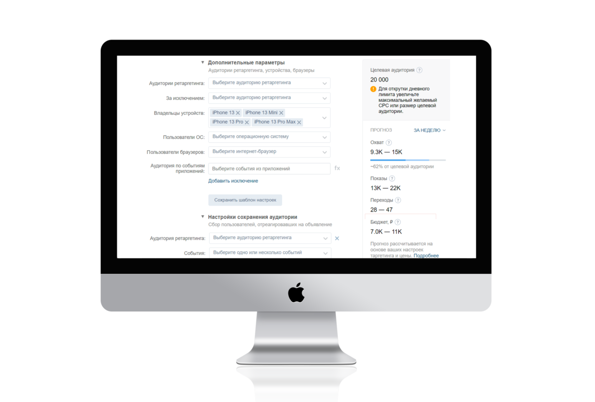 Iphone 13. Кроме того, мы отметили пользователей последних моделей смартфонов Apple 13. Данный таргетинг кому-то может показаться спорным, но с наложением других настроек он хорошо отрабатывает поиск платежеспособной аудитории.