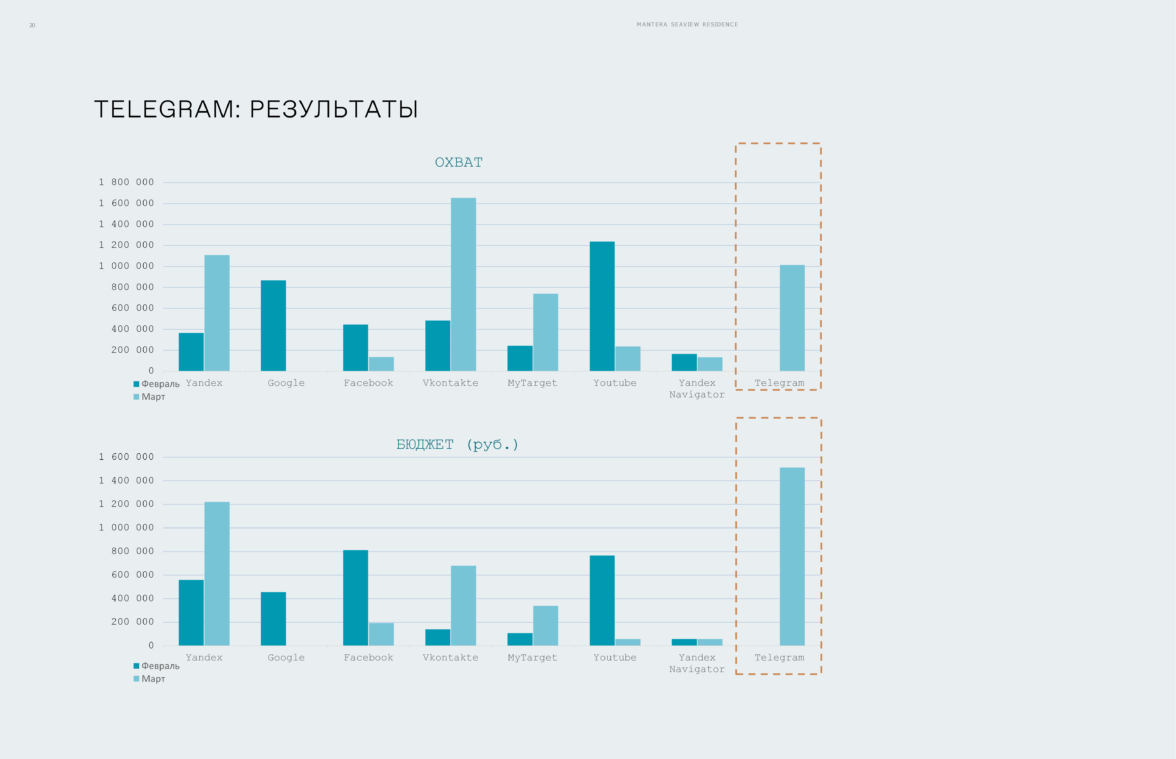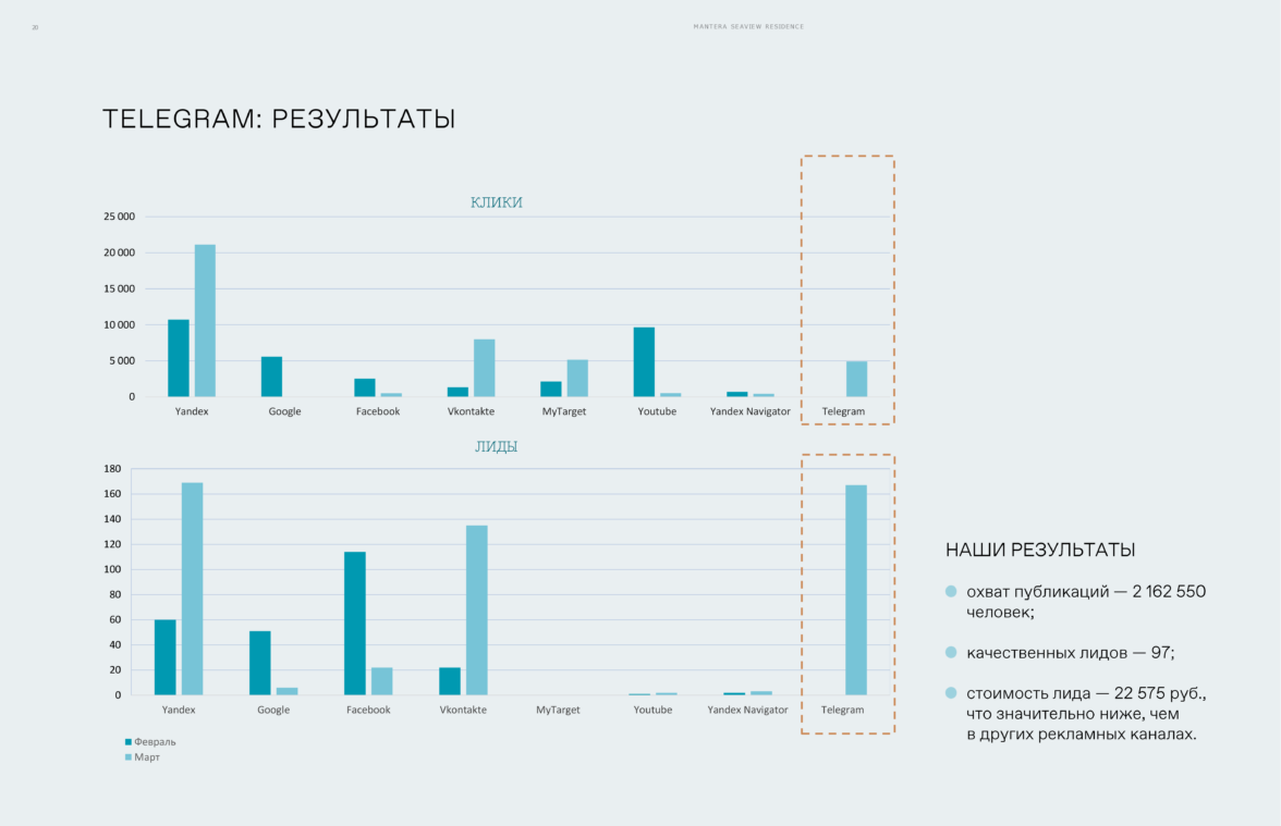 После запуска рекламных публикаций Mantera Seaview residence в Telegram стали активно размещаться и другие девелоперы с проектами luxury-класса. Получается, мы дали им толчок, став первопроходцами благодаря антикризисной стратегии.
