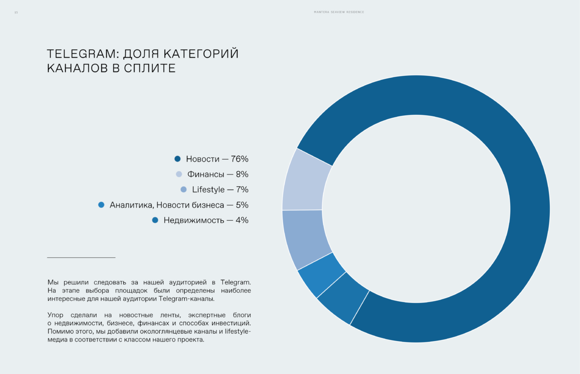 Мы решили следовать за нашей аудиторией в Telegram. На этапе выбора площадок были определены наиболее интересные для неё каналы. Упор сделали на новостные ленты, экспертные блоги о недвижимости, бизнесе, финансах и способах инвестиций. Помимо этого, мы добавили окологлянцевые каналы и lifestyle-медиа в соответствии с классом нашего проекта.