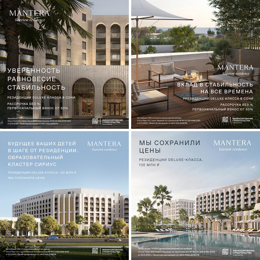Проект. Комплекс deluxe-резиденций Mantera Seaview residence возводится в Сочи на первой береговой линии в Имеретинской низменности. Он объединит сервис клубных резиденций и пятизвёздочных отелей. По данным консалтинговой компании Knight Frank, курортный комплекс станет самым дорогостоящим проектом за пределами столичного региона. Цена отдельных лотов уже превышает 3 млн руб. за кв. м.