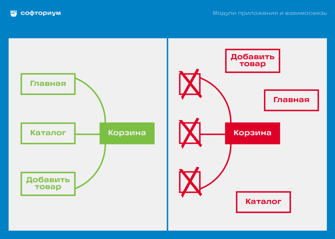 Если мы меняем что-то в корзине, то что-то придется поменять и в другом месте. Если переделываем корзину полностью, то, скорее всего, понадобится переписать все приложение. И все время фиксить связи корзины с другими модулями!