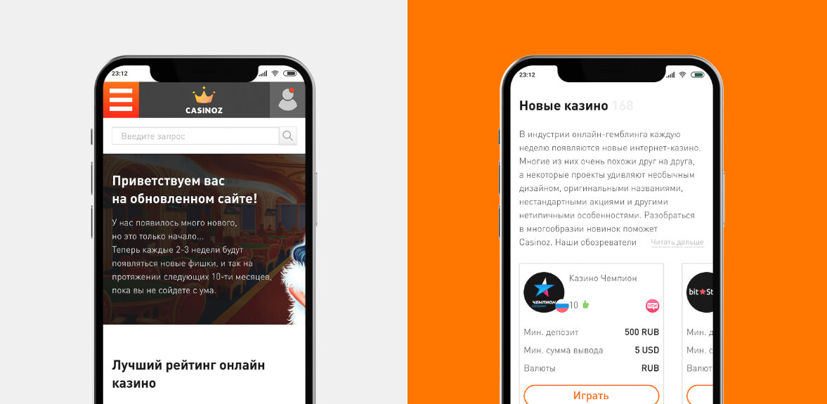 Одной из основных задач было найти свой визуальный язык и отстроиться от конкурентов. Так «Casinoz» получил современный стиль, но при этом сохранил свою фирменную атмосферу. Мы получили массу удовольствия от процесса работы.