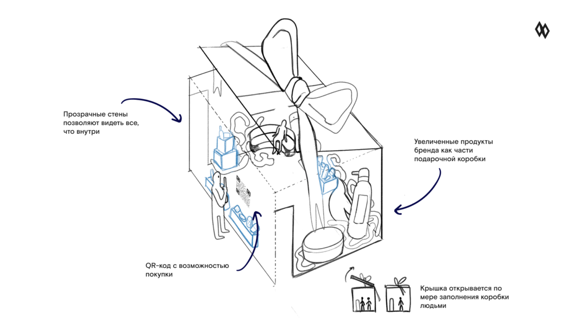 Коробка с подарками — один из очевидных символов новогоднего ритуала дарения (к слову, клиент сам в брифе упомянул, что можно попробовать сделать инсталляцию в виде коробки).