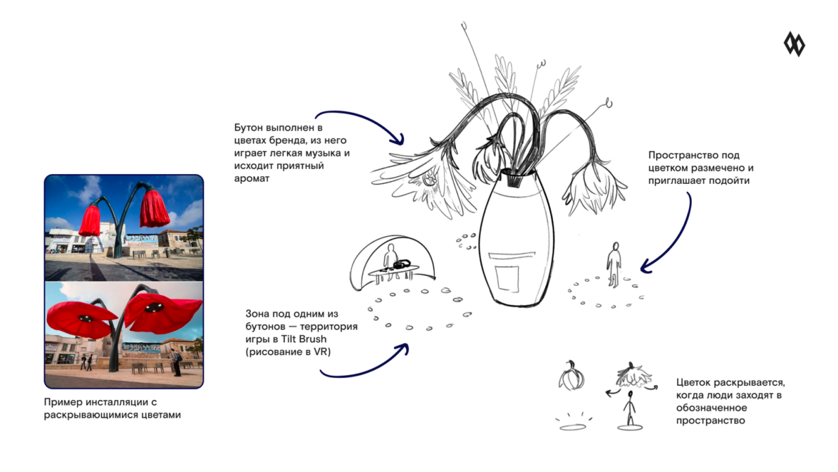 Рядом с цветами расположена интерактивная зона, в которой аниматор предлагает гостям попробовать себя в игре Tilt Brush. Игра позволяет гостю нарисовать что-либо в 3D-пространстве, но аниматоры призывают нарисовать картину в качестве подарка любимой маме / бабушке / сестре и т д.