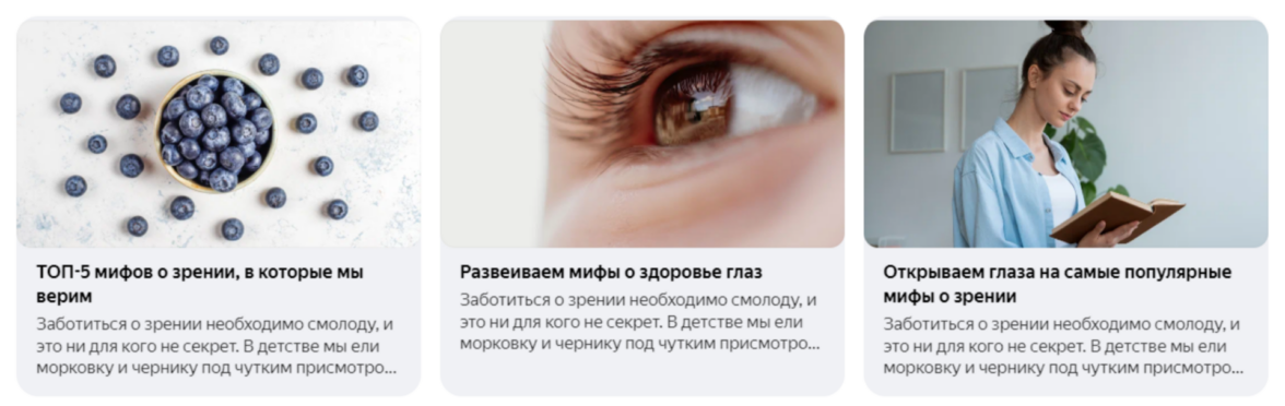 Самыми успешными публикациями стали: «Сухость глаз» (капли), «Популярные мифы о зрении» (витамины). На повторных запусках стоимость за дочитывание удалось снизить до минимальной — 3 руб. Формула успеха, которую нам удалось выявить — актуальность тематики (основаны на частотности запросов в Wordstat), проработка визуала, четкая структура, где сочеталась полезная и продуктовая часть, а также привлекательный call to action (анонсы скидок).