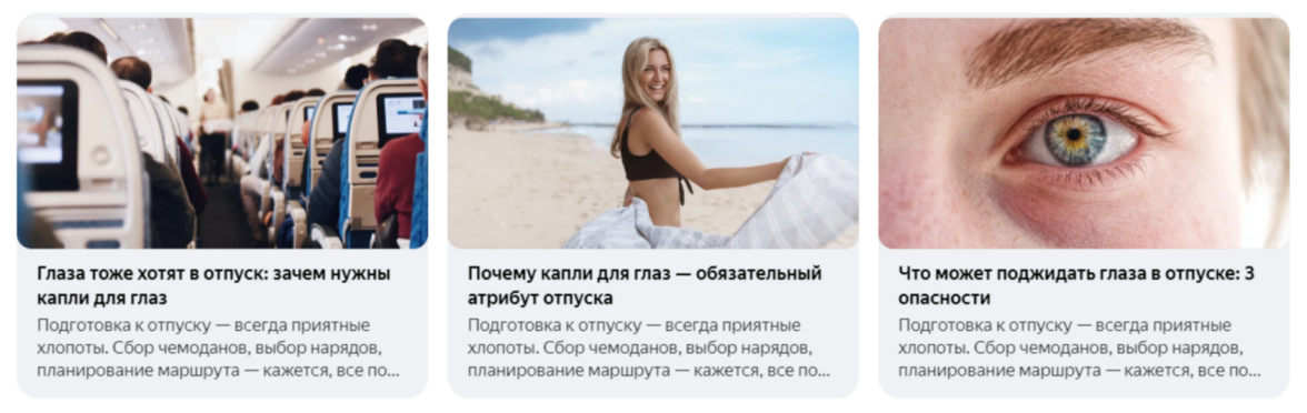 3. Учет сезонности и актуальности: стратегия продвижения учитывала сезонность и актуальность тем. Например, в летний период были подобраны темы, связанные с отпуском, и почему капли для глаз необходимы в поездке.
