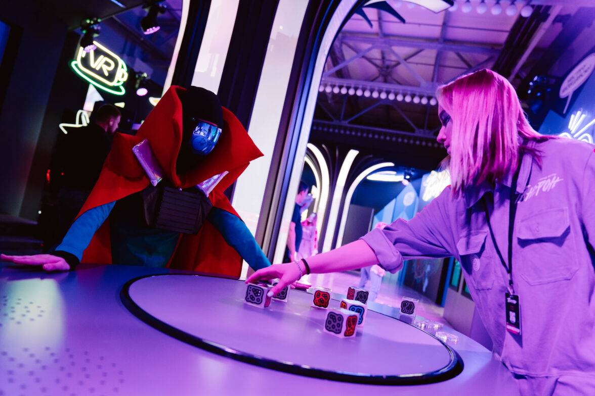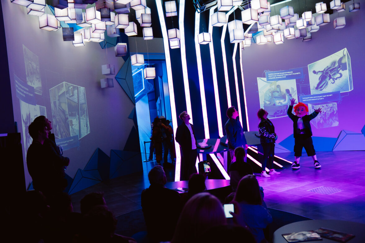 Мы хотели, чтобы посетители могли увидеть и виртуальный, и реальный мир Фанерона — с помощью метавселенной, VR и игровых механик в инсталляциях. А чтобы люди не запутались во всем многообразии, нужно было создать карту города и выстроить навигацию между разными мирами и их разделами. Поэтому мы сгруппировали все активности и варианты локаций, и разделили пространство Фанерона на два: интерактивное и лабораторное.