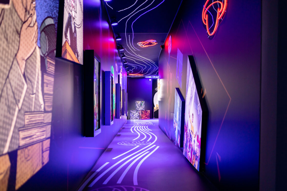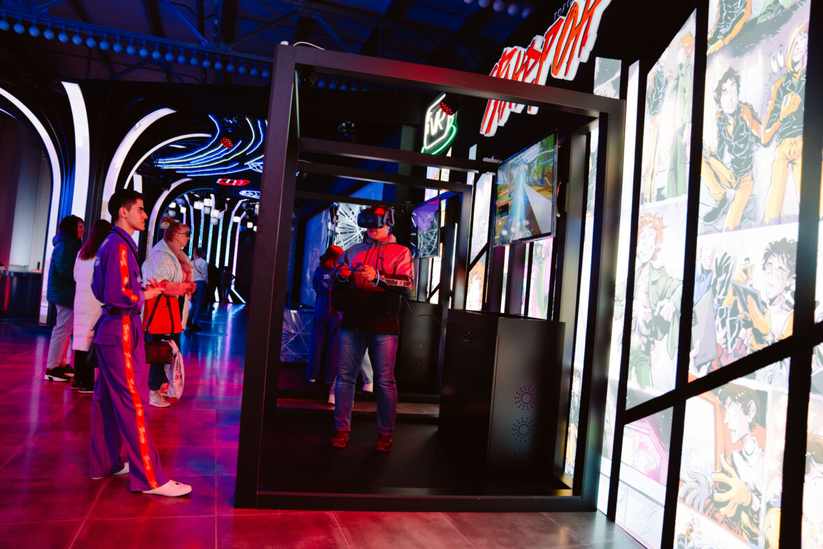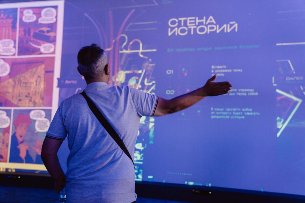 Эта зона — рай для визуалов. Огромная проекционная стена продолжает собой физическое пространство павильона — движение рук запускает перелистывание страниц гигантского комикса. Зачем это нужно? Чтобы увидеть истории героев Фанерона и их подвигов.