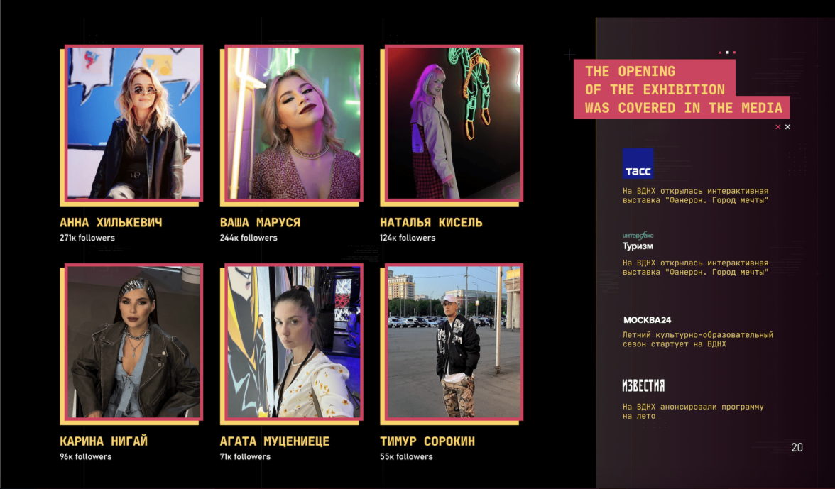На площадке прошло 6 крупных мероприятий, включая показ мод и особый косплей-фест. О них, а также о всей экспозиции рассказывали электронные, печатные издания, ТВ и соцсети — вышло более 50 материалов всероссийского значения, включая сюжеты телеканалов ВГТРК.