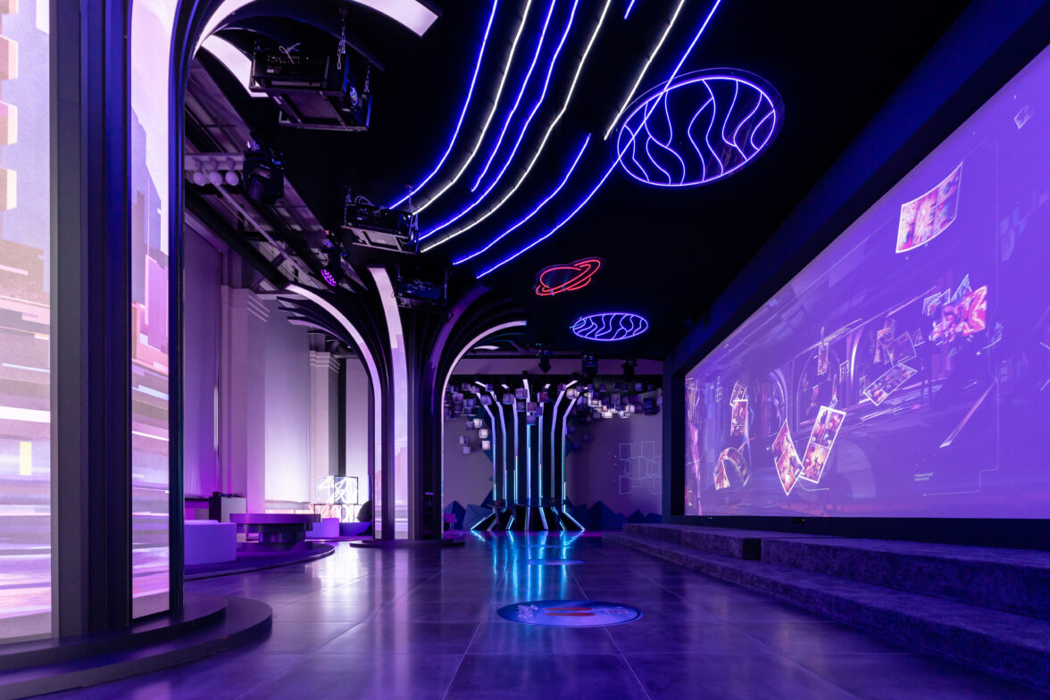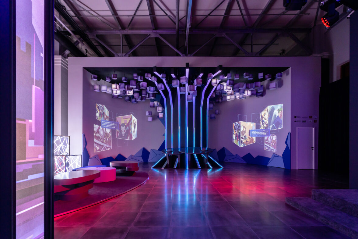 Здесь интерактивность усложняется. Касаясь touch-панели, человек оживляет огромное цифровое дерево. «Крона» из светящихся кубов и «ствол» приходят в движение, меняют цвета и начинают издавать звуки — дерево показывает воспоминания Фанерона.