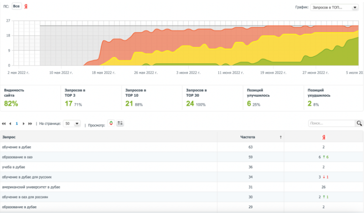 Первые результаты мы увидели уже 21 мая, когда сайт попал в топ по запросу «обучение в Дубае» в Санкт-Петербурге. Но самое интересное началось позже. К 5 июля, всего за 1,5 месяца, 90% наших запросов были в топ-10, а 60% из них — в топ-3 «Яндекса».