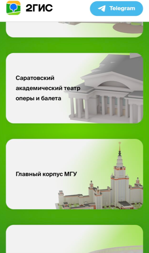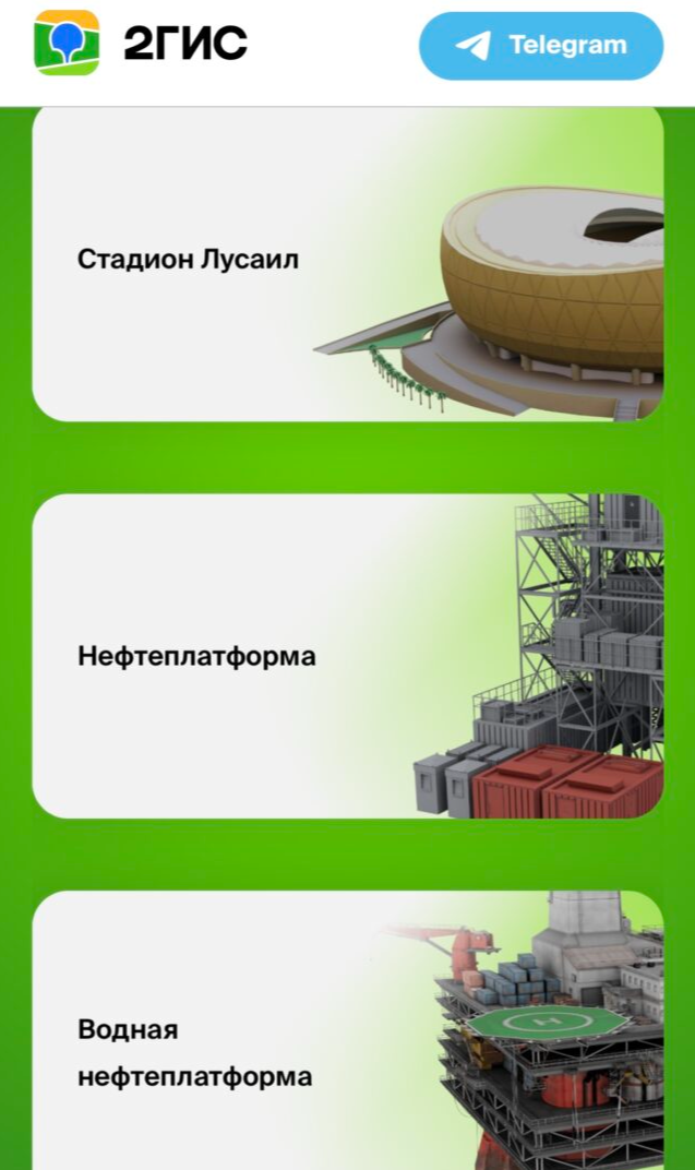 Пользователь через браузер открывает 16 Web-AR моделей выоскодетализированных зданий. Их можно рассмотреть со всех сторон и изменить масштаб. Геймификация здесь такая: пользователь ищет хитро спрятанные надписи на зданиях. После этого отправляет скриншоты через телеграм-бота 2ГИС и выигрывает призы.