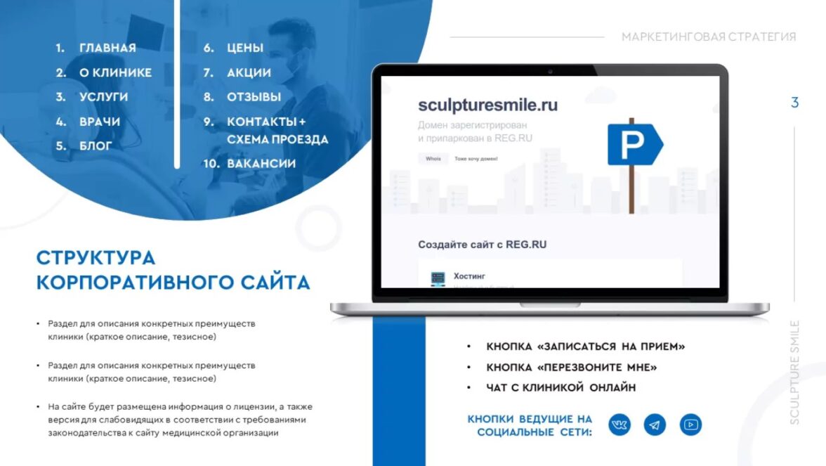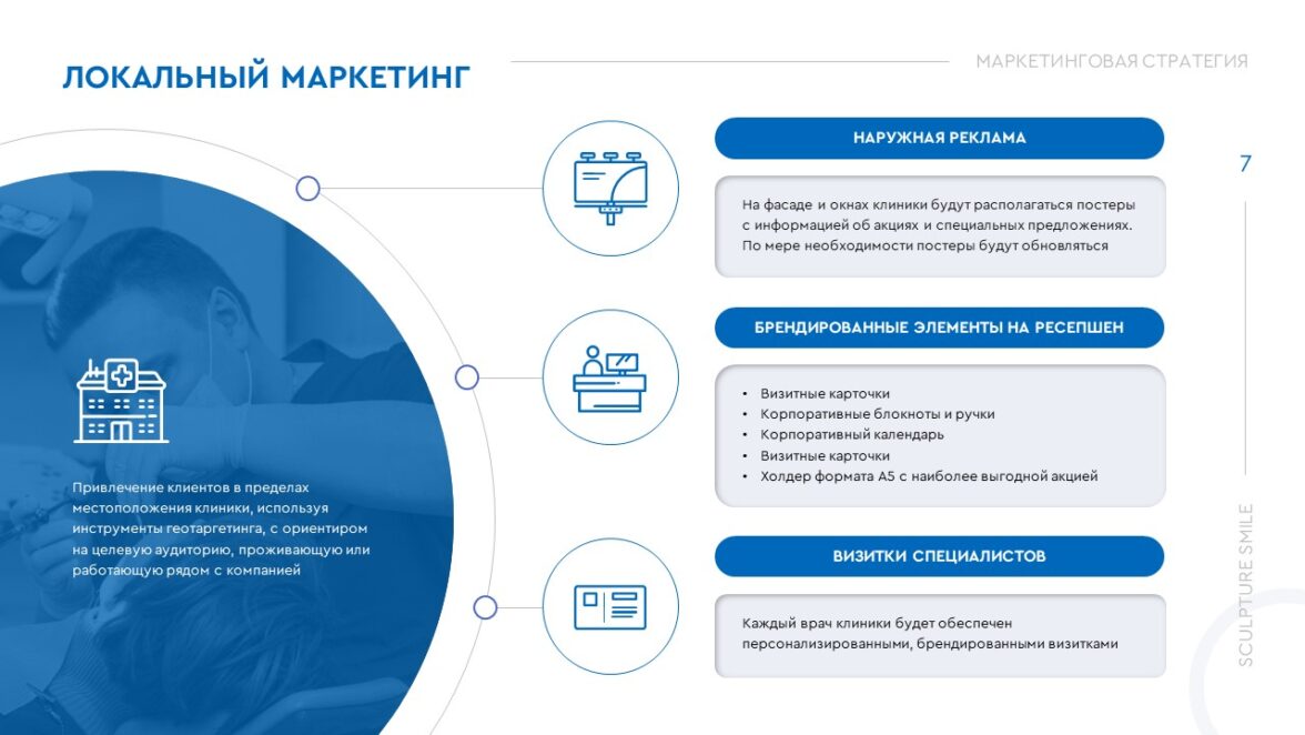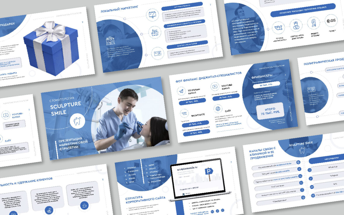 Вместе с заказчиком мы собрали и структурировали информацию. Наши копирайтеры тезисно отразили основные принципы маркетинговой стратегии:-каналы связи с клиникой;-структуру корпоративного сайта;-способы достижения целей, принципы удержания клиентов, управление репутации и т.д.А для того, чтобы информацию было легче воспринимать и запоминать, использовали инфографику, нумерованные списки, иконки. В презентации графические элементы сочетаются с фотографиями, предоставленными заказчиком.Какие ассоциации у вас возникают, когда речь идет об атмосфере в кабинете стоматолога? Что бы вы хотели там видеть? В первую очередь— чистоту, гигиену. Чтобы передать это, доминирующим цветом на слайдах мы сделали белый. Оттенки синего взяли из палитры самой стоматологической клиники.Шрифты использовали лаконичные, легко читаемые, ведь их главная цель — быстро передать смысл.