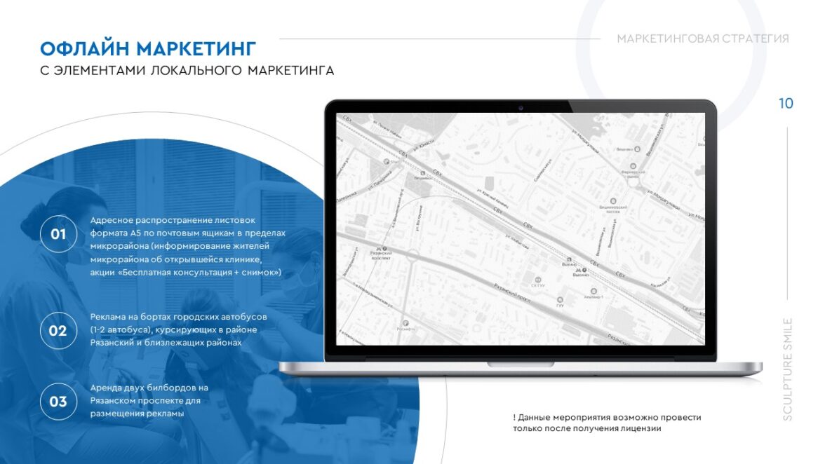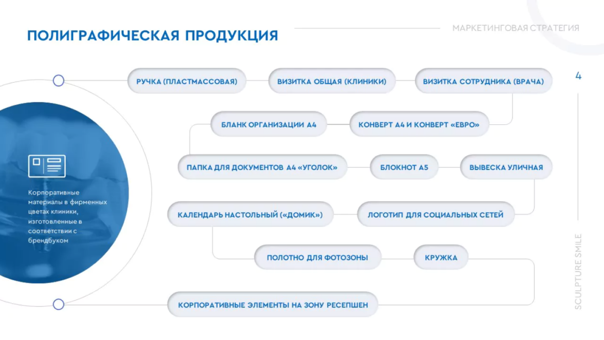 На проект для сотрудников Sculpture Smile у нас ушло 2 недели. На 13-и слайдах мы доступно отразили самую важную информацию для маркетинговой стратегии бренда: начиная от способов продвижения основных каналов связи до работы с отзывами. Заказчик принял презентацию в формате pptx, отметив качество выполнения работы и профессионализм нашей команды.