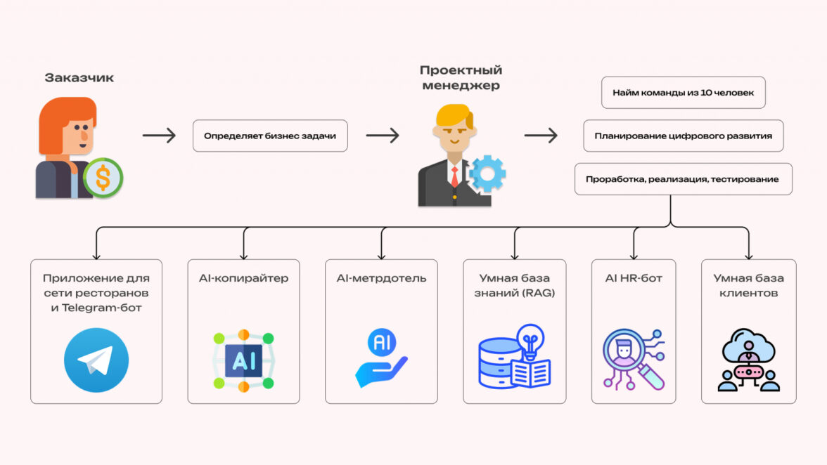 К нам обратился заказчик — сеть из 10 ресторанов. Первичный запрос был: помочь с реализацией приложения в виде Telegram mini app. Но довольно быстро стало ясно, что запрос у заказчика на большую цифровую трансформацию.