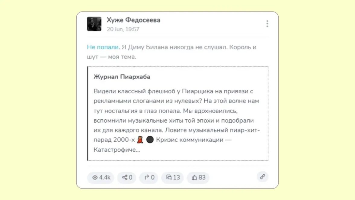 С каналом «Хуже Федосеева» не угадали, но он нас всё равно репостнул