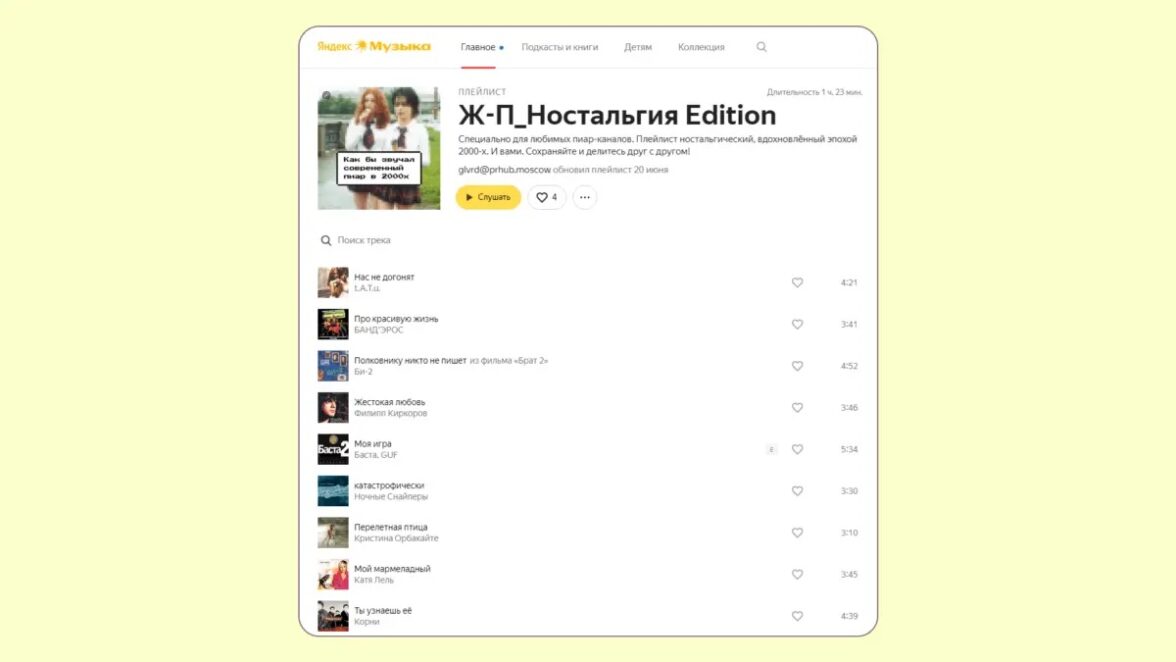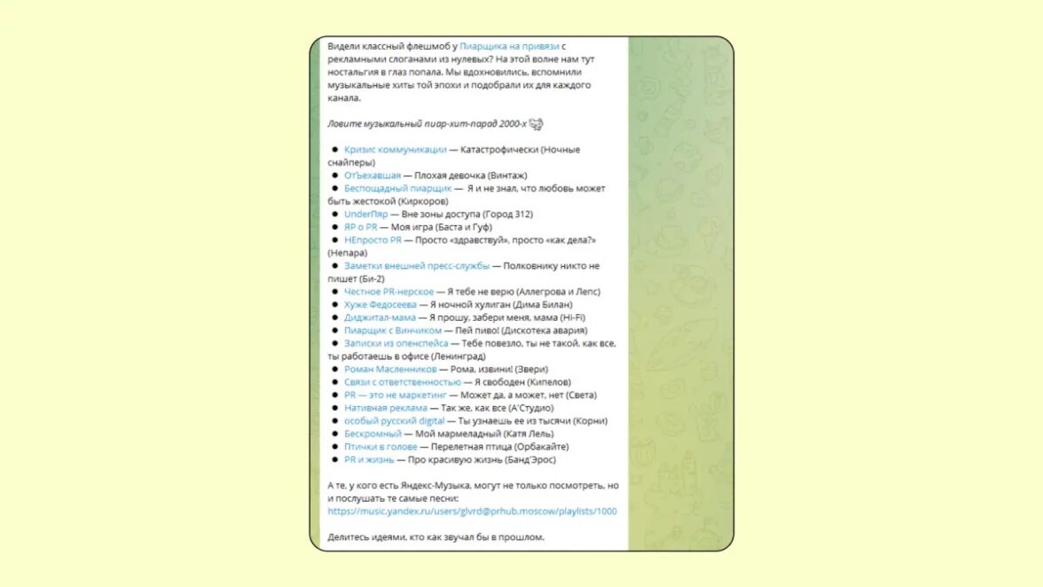 Мы решили, что это будет не просто список песен, а что-то более весомое и полезное. Поэтому мы собрали плейлист на Яндекс Музыке и прикрепили ссылку к посту с хит-парадом, чтобы человек мог перейти, послушать и проникнуться вайбом.