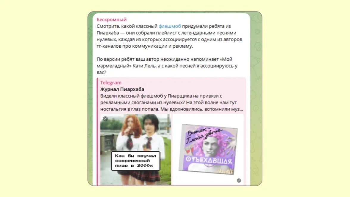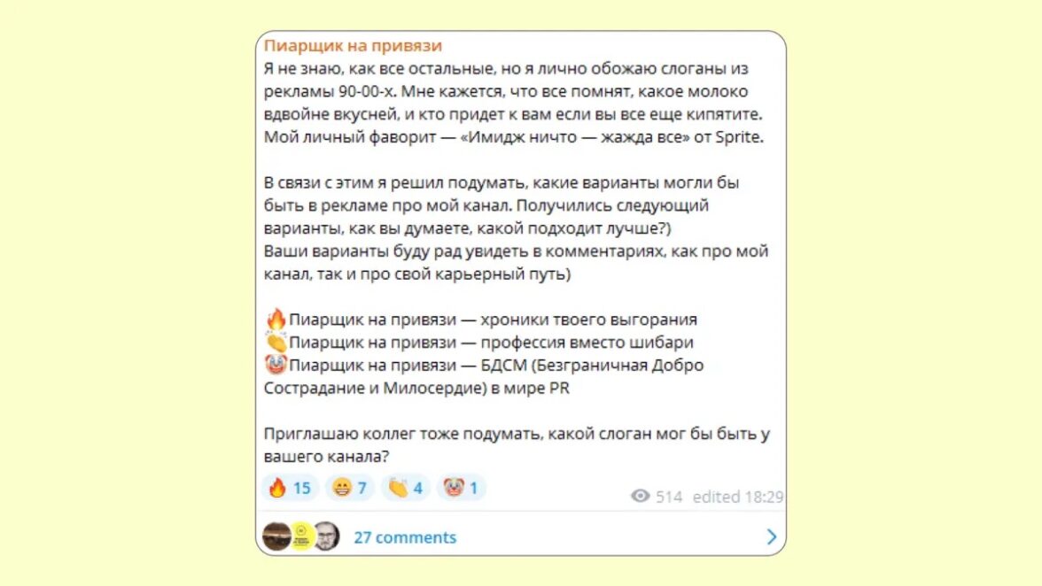 Телеграм-каналом Журнала тоже занимаемся мы. Пиар — узкая ниша, и чтобы о нашем канале узнали все существующие пиарщики, надо было придумать что-то такое, что перепостят другие крупные ребята из этой сферы.
