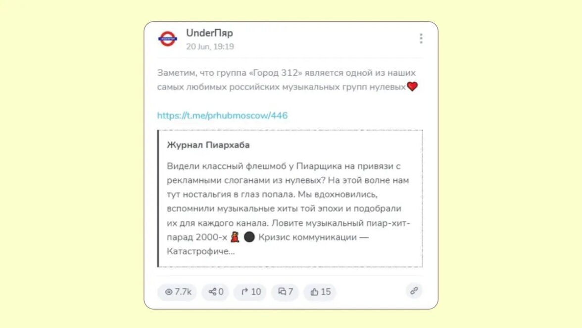 Здорово угадали с песней для канала Under PR. Мы выбрали «Вне зоны доступа» группы «Город 312», и оказалось, что это одна из любимых групп их команды.