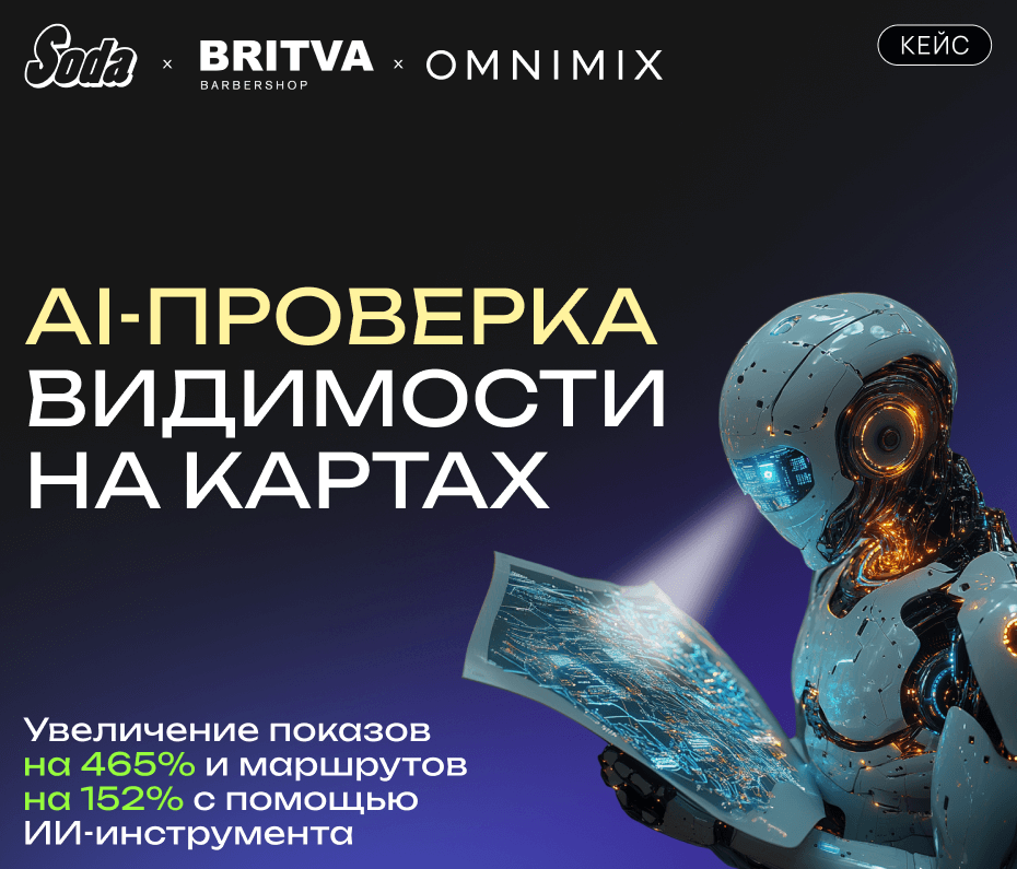Мы давно работаем с сетями салонов красоты Soda и барбершопов Britva, которые активно используют геоперформанс-рекламу в «Яндекс Картах» для привлечения новых клиентов и удержания постоянных. У Soda 82 филиалов, у Britva — 129. Видимость филиалов на «Картах» играет ключевую роль в маркетинговой стратегии, ведь потеря видимости напрямую сказывается на доходах и взаимоотношениях с клиентами.