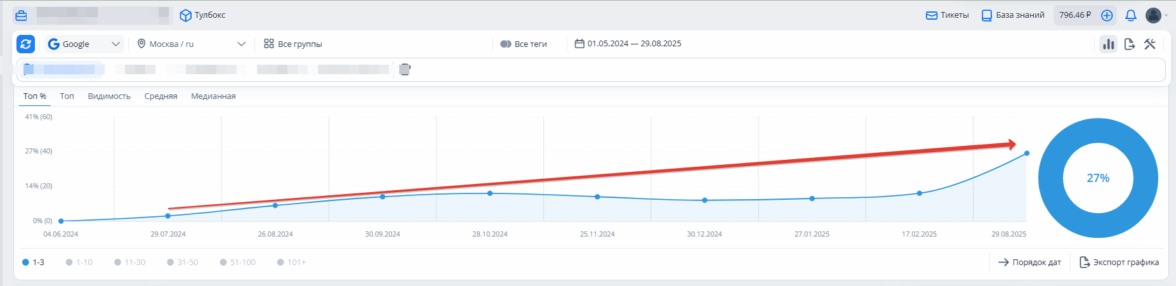 Доля ТОП-1–3 выросла:Яндекс: с 13% до 28%. Google: с 2% до 26%.