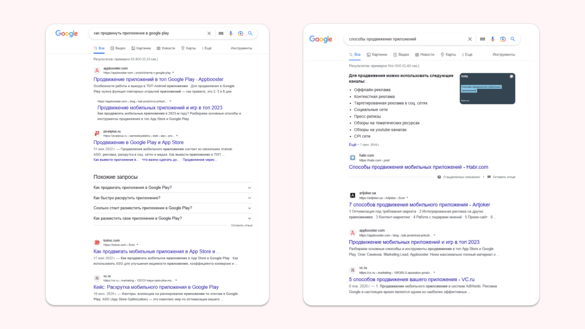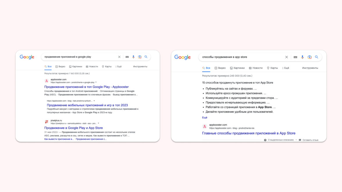 Мы смогли добиться вхождения в топ сразу нескольких материалов Appbooster и стали попадать в featured snippets