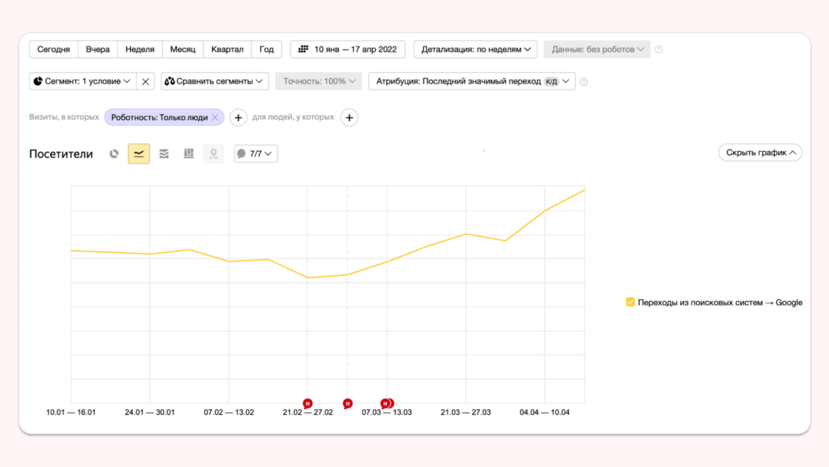 В целом в 2021 году на сайт пришло на 11% человек больше, чем в 2020-м, а к весне 2022-ого года наши позиции в Google укрепились еще сильнее. Отчасти этому способствовало отключение рекламы в поисковике — первые позиции в выдаче сразу забирали себе весь трафик.