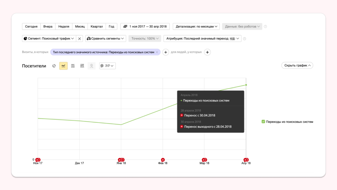 Собственно, спустя пару месяцев так всё и произошло: благодаря нашим изменениям трафик начал расти и увеличивался до самого лета. А мы кусали губы от обиды и зависти (шутка). К счастью, в Appbooster собралась адекватная команда: компания вернулась, когда сквозная аналитика показала, что канал SEO стал главным источником лидов.