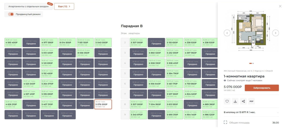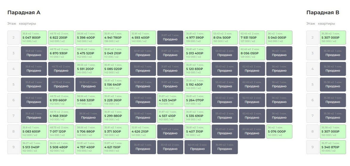 Та проблема с которой столкнулась предыдущая студия-исполнитель, была в реализации «шахматки», которая сейчас есть у всех больших игроков рынка. «Шахматка» уже стала своеобразным золотым стандартом для сайтов застройщиков. В каком-никаком виде, она существовала почти всегда, но была в экселе. Некоторые до сих пор так работают. Проданные квартиры закрашиваются в свой цвет. В ячейках мы видим минимальную информацию для клиента: цена за метр, площадь и сумма.