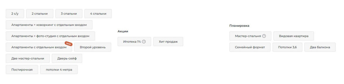 так же, введена дополнительная фильтрация по тегам квартир, список которых постоянно пополняется.