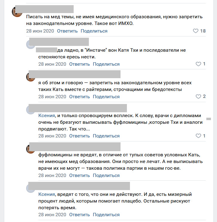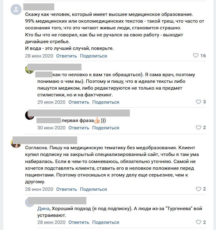 Один из самых удачных каналов — комментаторские ветки под постами в тематическом сообществе ВК. С несколькими крутыми ребятами мы так и познакомились. Запустили поиск по стене по запросам «медицина», «медицинский копирайтинг», «медицинские тексты». В одном из постов подписчики обсуждали, обязательно ли копирайтеру иметь медицинское образование и опыт работы, чтобы писать статьи про болезни и лечение. Спор был жарким — на десятки комментариев, иногда даже слишком эмоциональных.