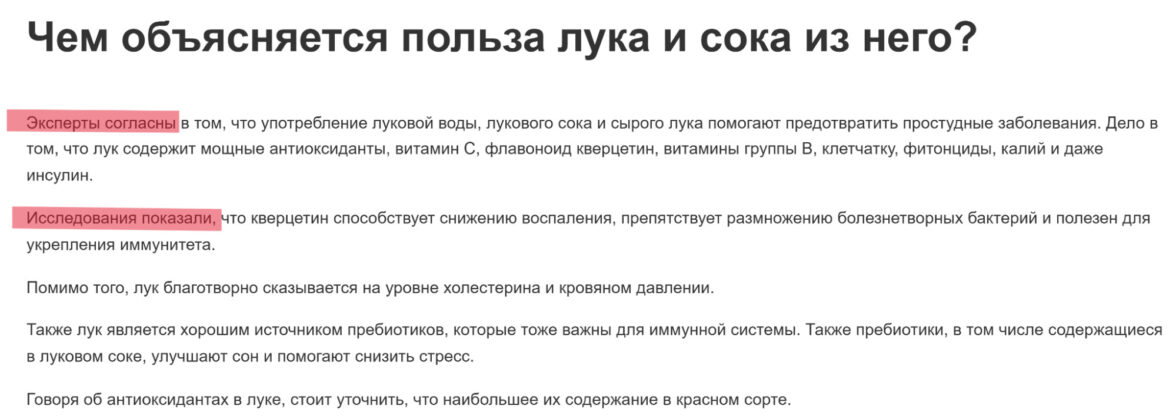 Статьи на околомедицинские тематики — как лечить грипп луком, имбирем, лимоном, как ставить горчичники от кашля — стабильно в топе поисковой выдачи и собирают десятки тысяч просмотров. Проблема в том, что большинство таких текстов публикуются на сомнительных сайтах без медицинской экспертизы и ссылок на достоверные источники. В текстах встречаются фразы вроде «эксперты доказали» или «исследования показали», но без конкретики: кто эти эксперты и что за исследования — остается загадкой. Такие материалы сложно воспринимать как достоверные.