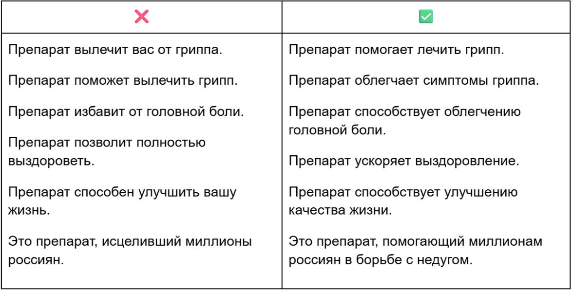 В текстах не должно быть того, что может создать у читателя иллюзию «волшебной таблетки», которая сразу и полностью решит его проблемы со здоровьем. Да, препарат может быть очень качественным, но мы не в силах гарантировать, что он поможет конкретному человеку.