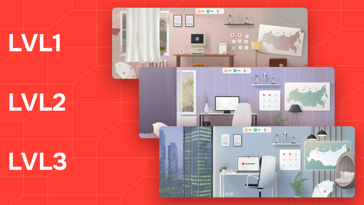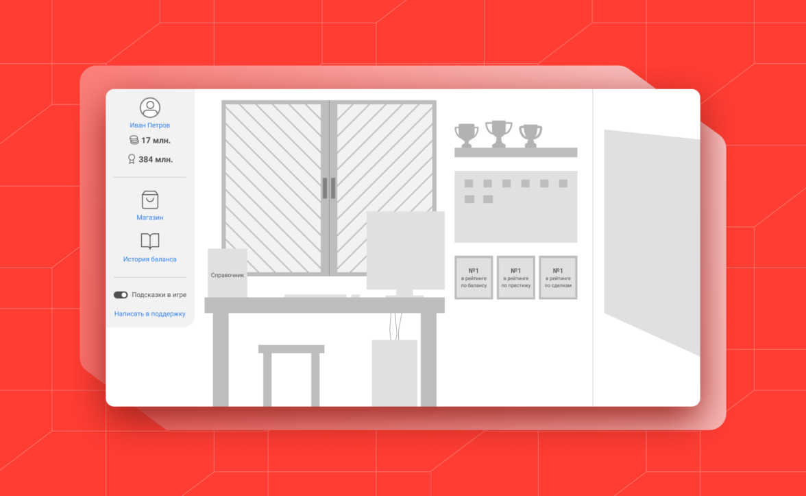 Предусмотрели возможность обновления как деталей элемента (кресло, стол, декор и т.д.), так и смены помещения в целом — переехать из хрущевки в «Москва-Сити». Суммарно задизайнили 4 варианта главного экрана. Пользователь может переехать в новый офис, если заработает достаточное количество валюты.