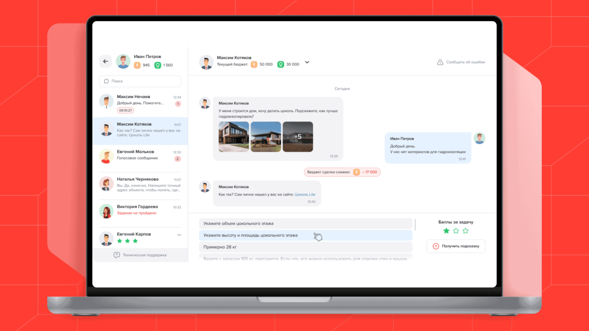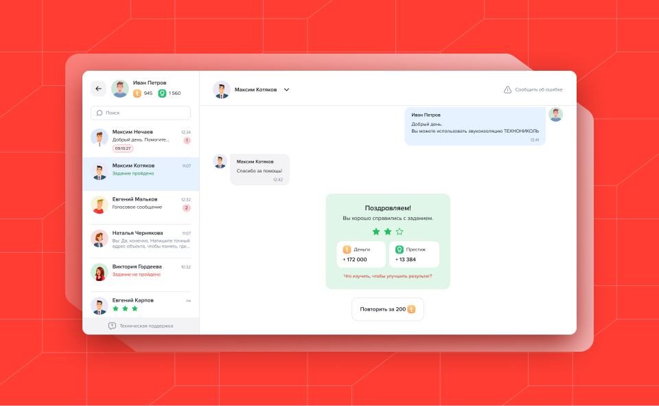 В первую очередь ТЕХНОМАТРИЦА создавалась для менеджеров по продажам ТЕХНОНИКОЛЬ. Поэтому нам нужно было придумать и реализовать проект, который с первых секунд заинтересует юзеров и будет мотивировать их продолжать пользоваться сервисом.