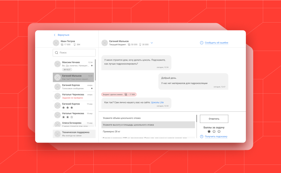 С диалоговым меню поступили просто — взяли привычные паттерны социальных сетей и реализовали его во внутреннем функционале ТЕХНОМАТРИЦЫ. Таким образом слева пользователи видят все чаты, а также балл, который был получен за задание. А при клике на собеседника открывается полный диалог с возможностью общения.