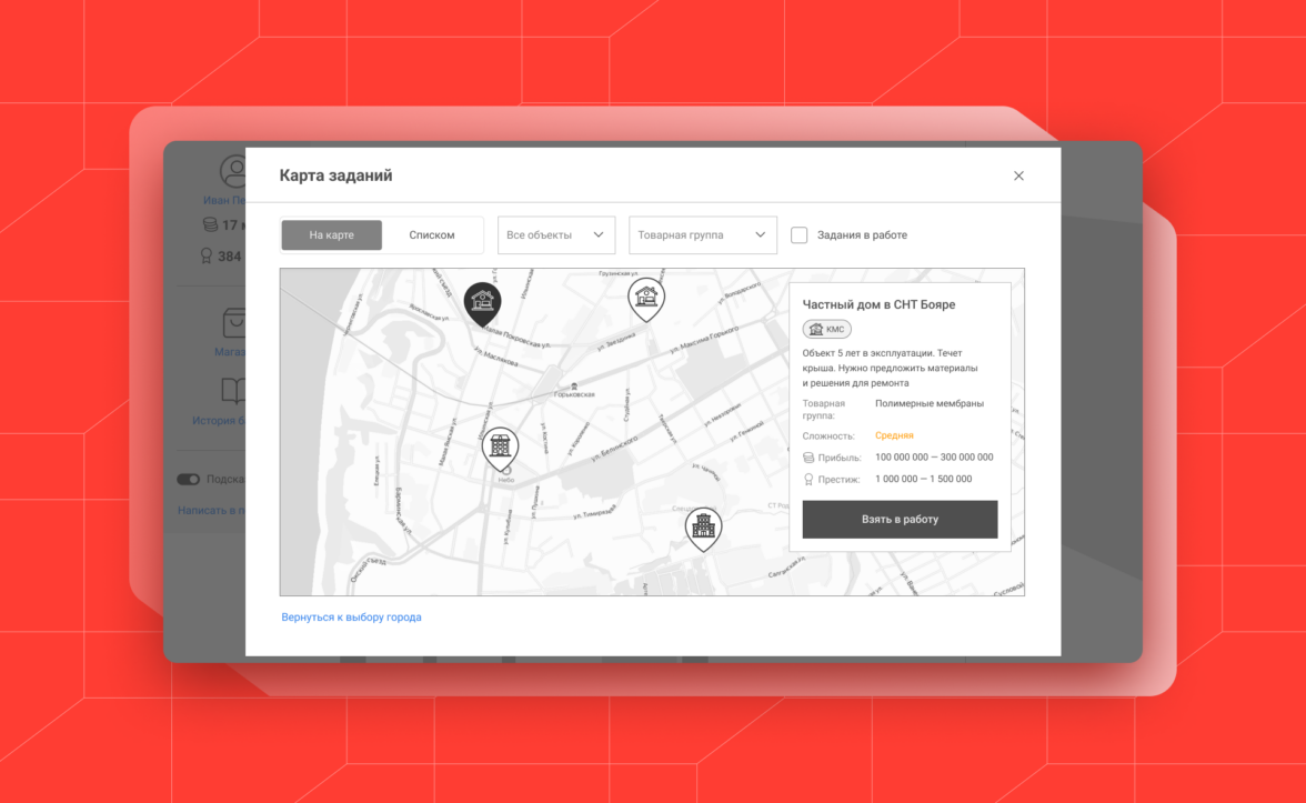 На карте также показывается краткое описание задания — проблема заказчика, информация об объекте и результат, которого вы должны достигнуть.