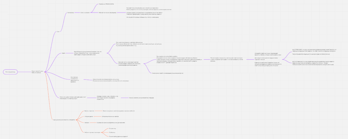 В начале мы разработали майндмап, на котором показали пользовательский путь потенциального игрока. По задумке после регистрации юзера встречает главное меню, которое и является ключевым в данном проекте. Это место, которое далее мы будем называть «хаб», переводит игрока на активные события в ТЕХНОМАТРИЦЕ.