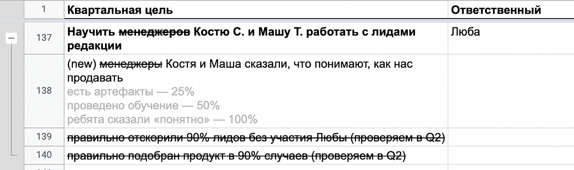 Оказалось, что это нормально — менять квартальные цели, когда меняется внешняя ситуация или внутреннее понимание вопроса. Как следствие, меняются и метрики — критерии выполнения цели и планы продвижения к ней.