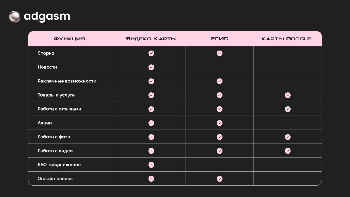 Мы фокусируемся на Яндекс Картах, поскольку он популярен, и у сервиса более широкий функционал для привлечения аудитории. Например, компании могут публиковать сторис, новости, акции, карточки товаров и услуг. Кроме того, только в Яндекс Картах бизнес может использовать SEO-продвижение.