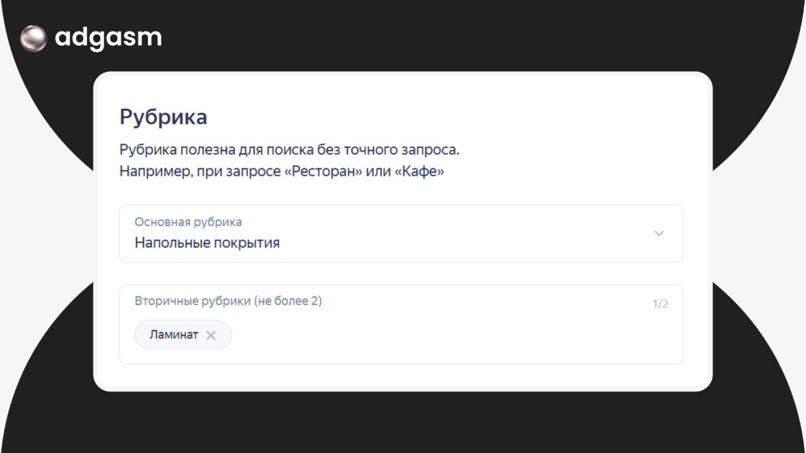 В стандартных настройках Яндекс Бизнеса функция оптимизации отсутствует, можно выбрать только рубрики: для BSPOL выбрали «напольные покрытия» и «ламинат». Несмотря на это, по части запросов мы не показывались вообще либо были очень низко в поисковой выдаче карт.