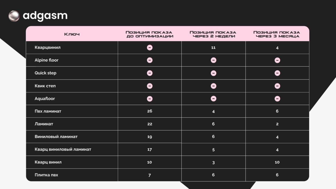 Но даже после проведенных работ компания не показывается по брендовым запросам фирм ламината. Скорее всего, это связано с тем, что по этим запросам в выдаче показываются только фирменные брендовые магазины «Alpine floor» и «Quick step», «Aquafloor».